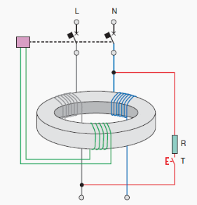 این وسیله از یک محفظه که داخل آن یک کلید مغناطیسی و یک مبدل جریان قرار دارد، تشکیل شده است در این وسیله یک هسته مغناطیسی همه هادی های حامل جریان را در بر می گیرد. در این حالت شار مغناطیسی که در هسته به وجود می آید، به جمع برداری جریان های عبوری از هادی ها بستگی دارد. اگر جریان عبوری I1 را مثبت در نظر بگیریم، آنگاه جریان I2 که در خلاف جهت جریان دارد منفی خواهد شد. در یک مدار معمولی سالم I1+I2=0 خواهد شد و هیچ شاری در هسته مغناطیسی به وجود نخواهد آمد و هیچ ولتاژی هم در سیم پیچ آن القا نخواهد شد.