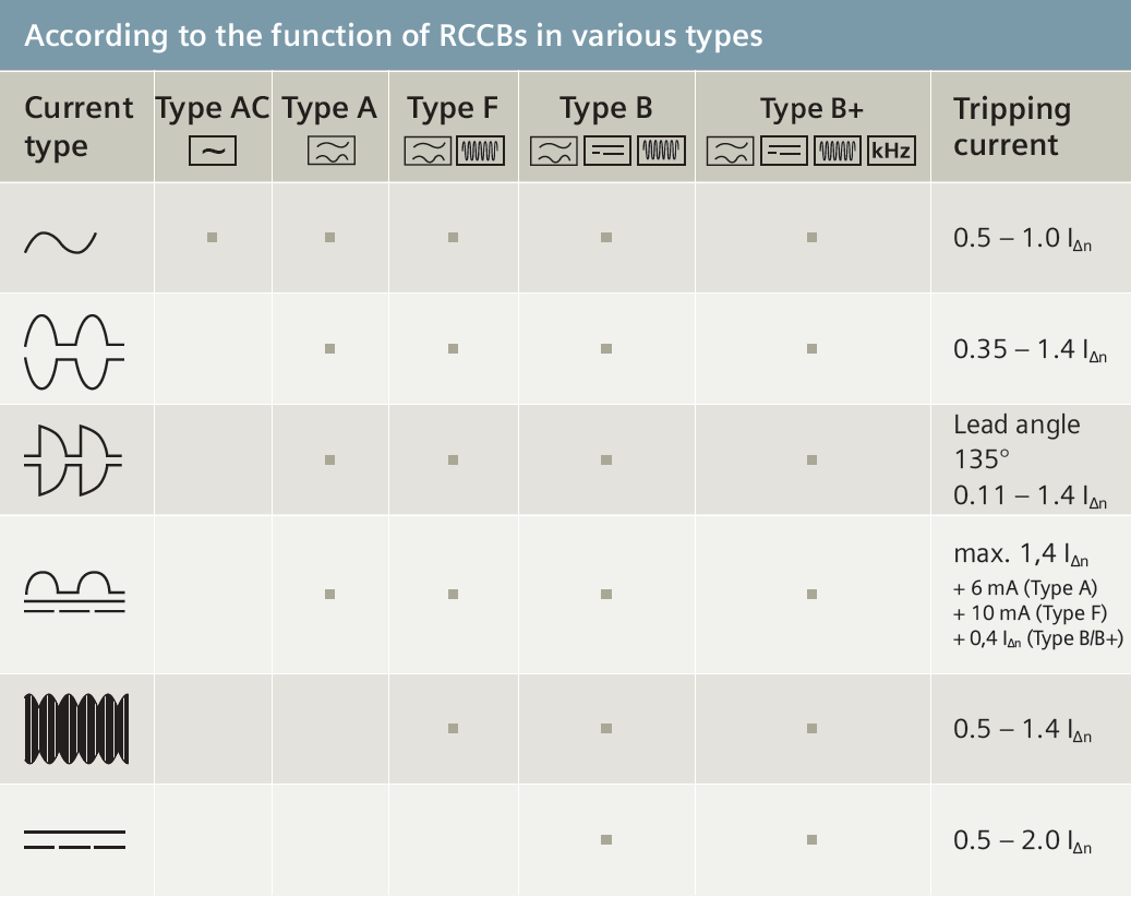 • نوع B: جریان‌ های DC صاف، جریان های متناوب سینوسی و جریان‌ های DC پالس‌ دار شناسایی می‌ کند.