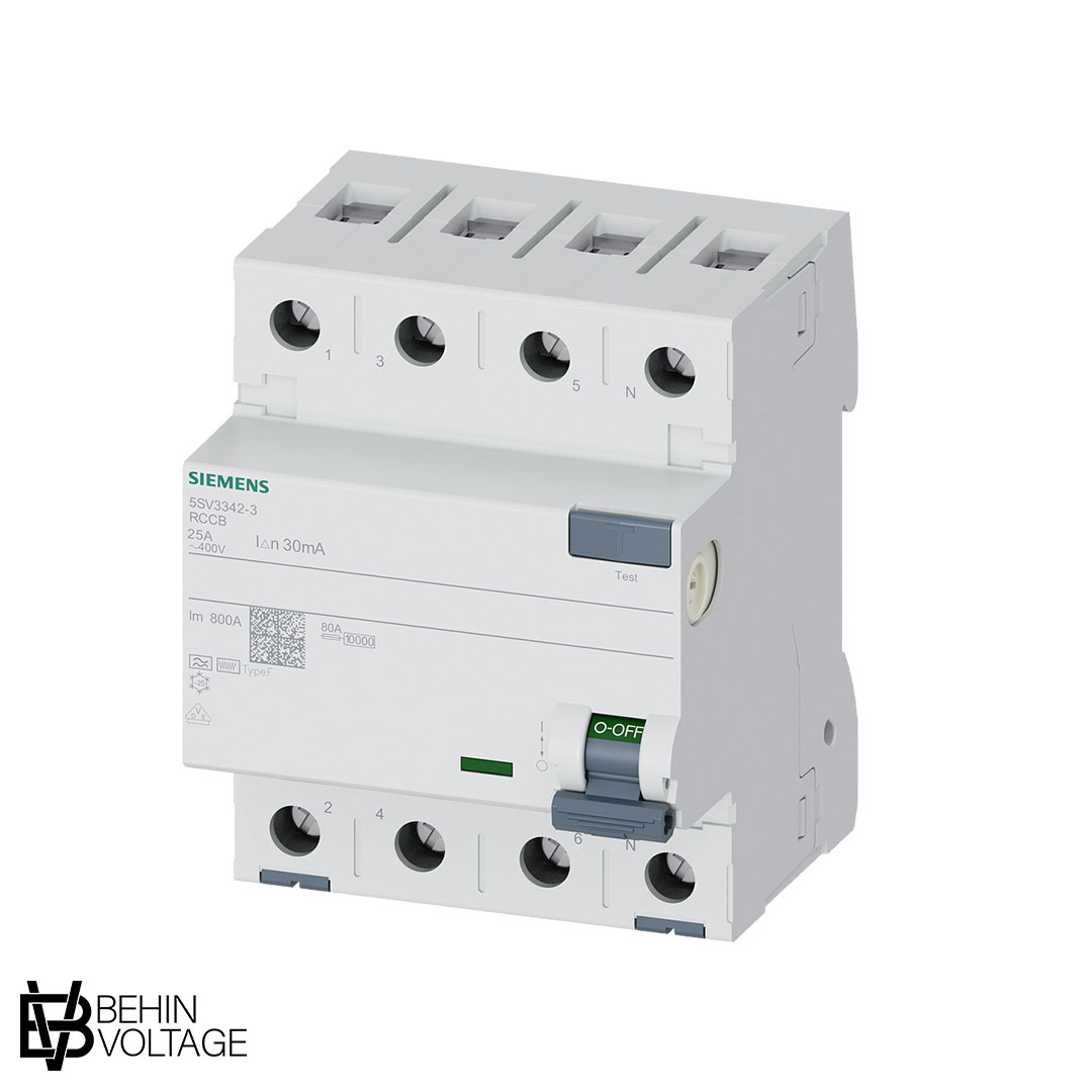 کلید محافظ جان سری 5SV زیمنس، ولتاژ 230VAC/50Hz، چهار پل، 25 آمپر، جریان تشخیص خطای 30mA