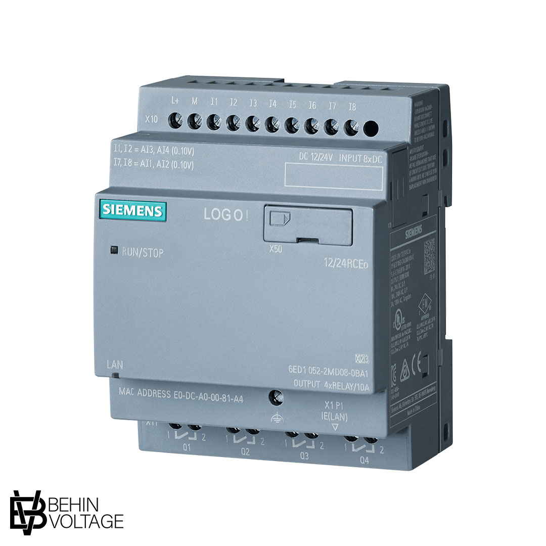 مینی پی ال سی لوگو زیمنس LOGO! 12/24RCEo، ماژول CPU، ولتاژ تغذیه 12VDC یا 24VDC، بدون صفحه نمایشگر، دارای 8 ورودی دیجیتال (قابل استفاده به صورت 4 ورودی آنالوگ ولتاژی)، دارای 4 خروجی دیجیتال رله ای، ماژولار و قابل ارتفاء، قابلیت استفاده تا 400 بلاک برنامه نویسی، دارای پورت رابط و شبکه Ethernet، دارای قابلیت web server تحت Ethernet، دارای قابلیت Data logging، دارای ورودی کارت microSD، برنامه نویسی با نرم اقزار LOGO Soft Comfort V8.4 به بالا، قابلیت اجرای برنامه های با ورژن پایین تر