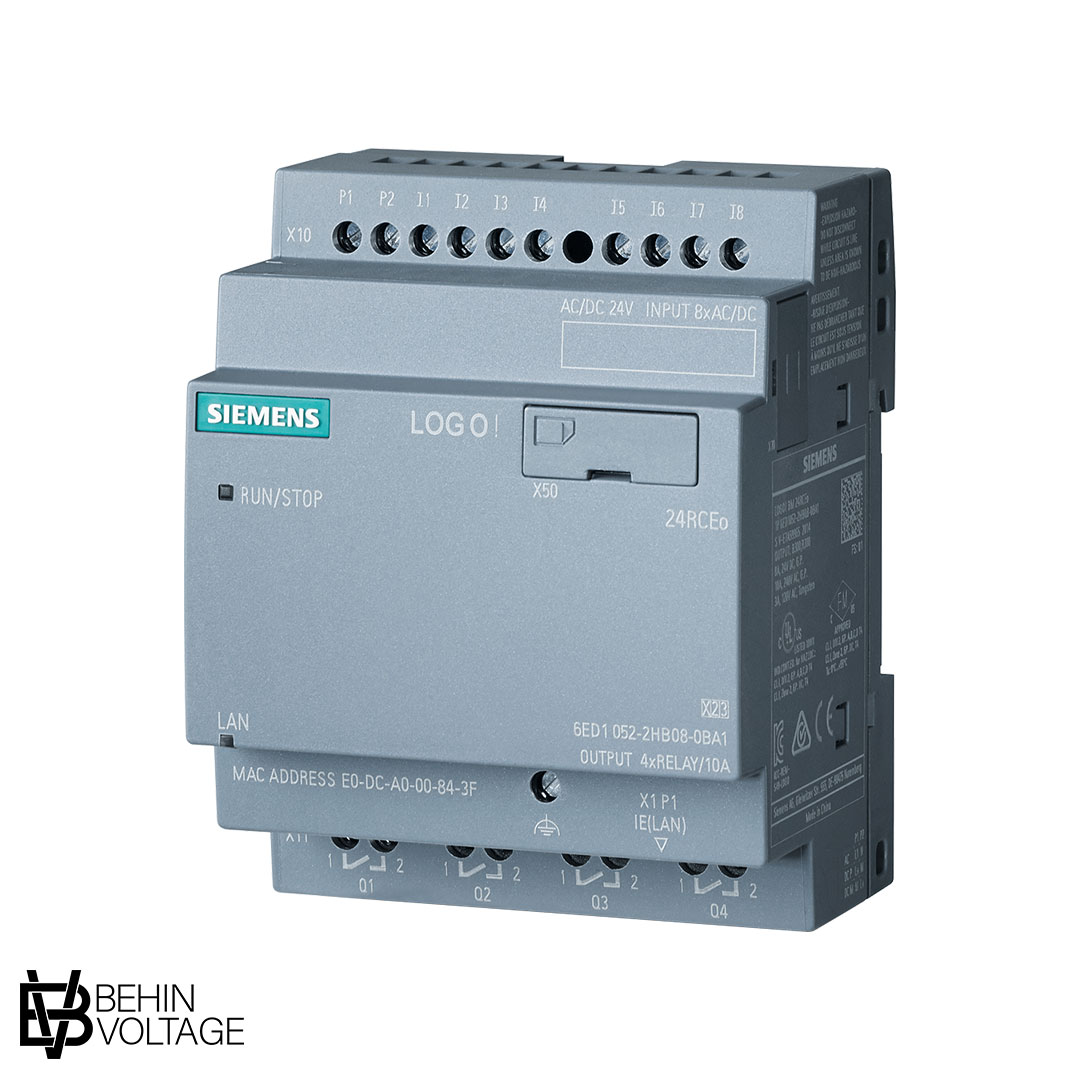 مینی پی ال سی لوگو زیمنس LOGO! 24RCEo، ماژول CPU، ولتاژ تغذیه 24VDC یا 24VAC، بدون صفحه نمایشگر، دارای 8 ورودی دیجیتال (قابل استفاده به صورت 4 ورودی آنالوگ ولتاژی)، دارای 4 خروجی دیجیتال رله ای، ماژولار و قابل ارتفاء، قابلیت استفاده تا 400 بلاک برنامه نویسی، دارای پورت رابط و شبکه Ethernet، دارای قابلیت web server تحت Ethernet، دارای قابلیت Data logging، دارای ورودی کارت microSD، برنامه نویسی با نرم اقزار LOGO Soft Comfort V8.4 به بالا، قابلیت اجرای برنامه های با ورژن پایین تر